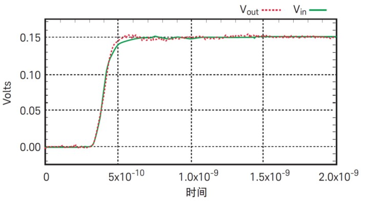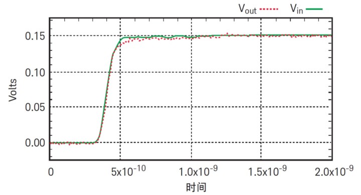 圖 5 顯示了對于輸入約 100 ps 上升時間的階躍信號,差分探頭所測得的時域響應(yīng)。圖 6 顯示了對于輸入約 100 ps 上升時間的階躍信號,單端探頭所測得的時域響應(yīng)。在這兩個圖中,紅色軌跡是探頭的輸出,綠色軌跡是探頭的輸入。應(yīng)注意這不是探頭的階躍響應(yīng),而只是測量它們能在多大程度上跟蹤 100 ps 的階躍信號。為測量階躍響應(yīng),輸入必須是非常完美的、有極快上升時間的階躍信號,此時差分探頭能顯示出比單端探頭更快的上升時間。這兩種探頭都能很好地跟蹤 100 ps 的階躍信號。