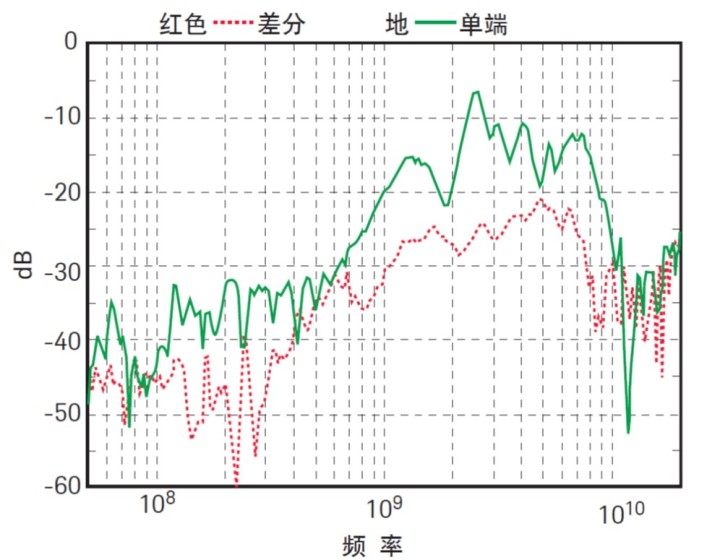 當(dāng)您檢測含有共模噪聲的單端信號時,需要確定是差分探頭還是單端探頭有更好的共模抑制能力。這取決于單端探頭的接地連接電感,以及差分探頭中放大器的共模抑制能力。對于本例中的差分和單端探頭前端,圖 7 顯示差分探頭的共模抑制要比單端探頭高得多,因此在高共模噪聲環(huán)境中能夠進(jìn)行更好的測量。這是兩種探頭最常見的情況,除非單端探頭有極低電感的接地連接,但這在現(xiàn)實中是難以實現(xiàn)的。應(yīng)注意這里分析的單端探頭,其共模抑制能力遠(yuǎn)好于其他許多單端探頭,因為它的地線很短。圖 7 中的共模響應(yīng)定義為 :