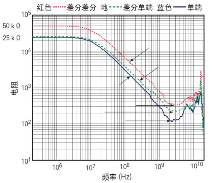 圖 8 是差分探頭和單端探頭的輸入阻抗 ( 幅值 ) 圖。紅色軌跡是施加差分源時所看到的差分探頭阻抗。綠色軌跡是施加單端源時看到的差分探頭阻抗,藍(lán)色軌跡是施加單端源時看到的單端探頭阻抗。圖 8 中標(biāo)注了這三種情況的直流電阻、電容和最小電感值。應(yīng)注意差分探頭和單端探頭對單端信號的輸入阻抗很類似。